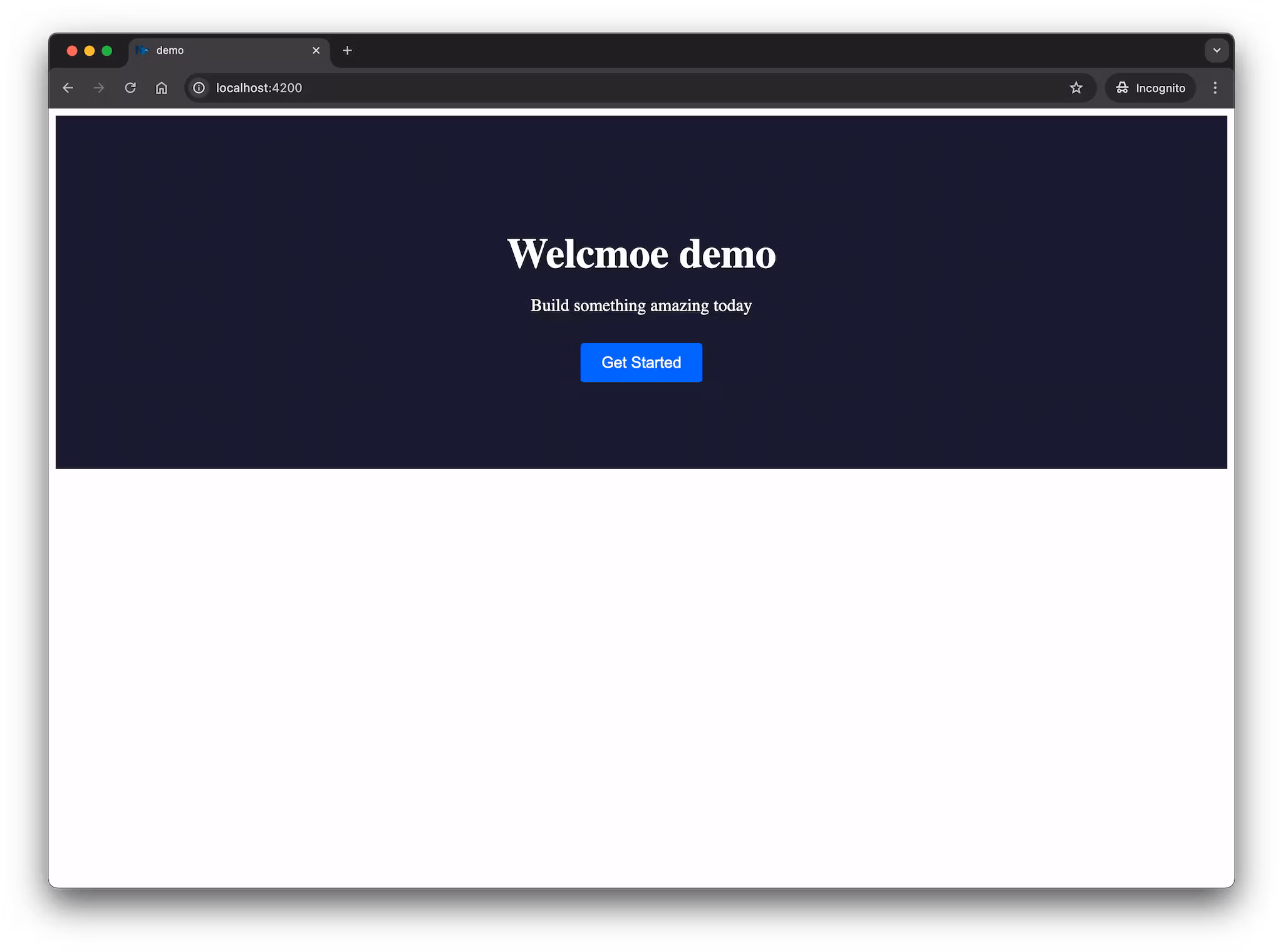 <lib-hero title="Welcmoe angular-demo" subtitle="Build something amazing today" cta="Get Started"></lib-hero><router-outlet></router-outlet>Serve your app again (npx nx serve angular-demo) and you should see the new Hero component from the ui library rendered on the home page.
